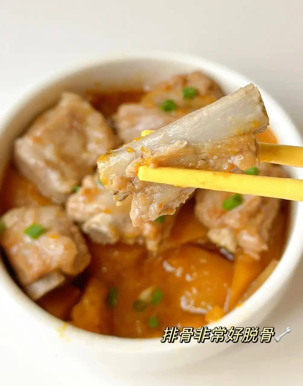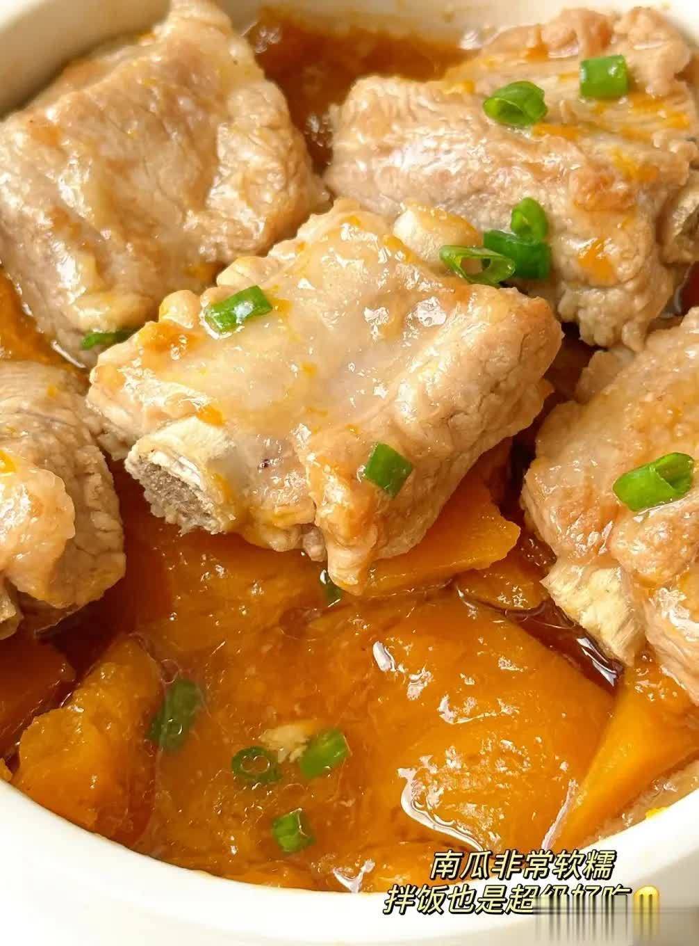 排骨一抿就脱骨,汁水丰盈;南瓜软糯香甜,吸饱了肉汁,比排骨还受欢迎!这道菜一做,饭和菜都齐了,香迷糊了!