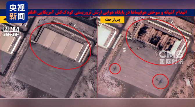 △伊朗12日晚公布其对美军在中东多处基地进行袭击前后卫星图像对比